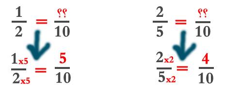 وكما هو موضح في الشكل أعلاه فإنه حتى نحول العدد ½ لعدد مقامه 10، سنضرب في 5/5، وحتى نحول العدد 2/5 إلى عدد مقامه 10 سنضرب في 2/2.