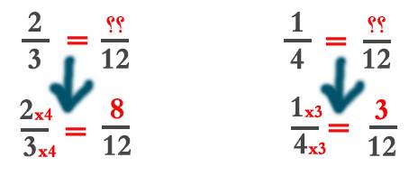 لم أكن أعلم قيمة العدد 1 قبل هذا الموقف. الآن يمكن أن يحل لنا مشاكل كثيرة. فللمقارنة بين 2/3 , 1/4 سنكون في حاجة إلى توحيد مقامهما للعدد 12 وهو حاصل ضرب المقامين (3×4). هنا سينقذنا العدد 1 فحتى نجعل المقامات 12 سنضرب 2/3 في 4/4 ليكون الناتج 8/12 كما سنضرب العدد 1/4 في 3/3 ليكون الناتج 3/12 وبذلك يكون 8/12 أكبر من 3/12 أي أن 2/3 > 1/4 كما هو موضح في الشكل أسفل.