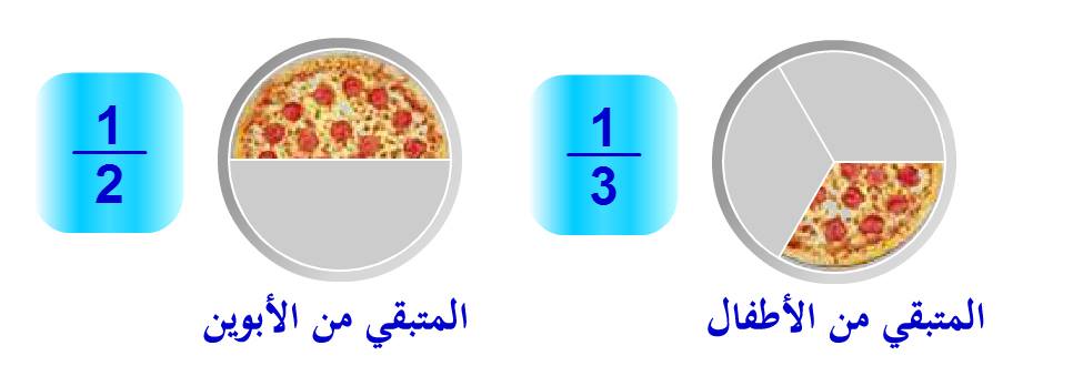 أكل الأبوين نصف بيتزا (1/2)، أما الأطفال فأكلو قطعتين فقط أي (2/3). وبذلك أصبح متبقي لدي من بيتزا الأبوين1/2 بيتزا، ومن وجبة الأطفال قطعة واحدة أي 1/3 بيتزا. كما هو موضح في الصورة.