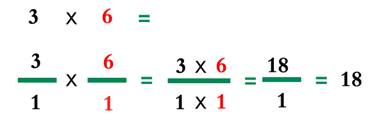 ولو تأملنا سنجد أن هذا ما يحدث أيضاً عند ضرب عددين مثل (3×6) فرقم 3 في صورته النسبية هو3/1 ، ورقم 6 هو 6/1 وبضرب بسطي الرقمين وضرب المقامين يكون الناتج 18 كما هو موضح في الصورة.